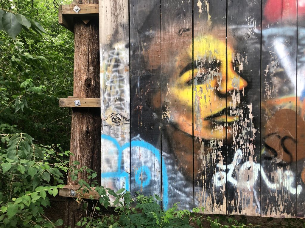 This weekend, we retreated down a wooded path for a new place to explore. Nature gave us life as we headed deeper into the forest. A wall of green grew up around us, towering above my head. If you’ve been on the prairie, you know that congregating trees are a rarity. While we continued the worn path, a bright flash of color caught my eye slightly off trail. I noticed a small path diverging, and I stepped off for a moment. I wanted to satisfy my curiosity, and I assured Jonathan I would catch up. As I made my way forward, I saw a tall structure that looked almost like a treehouse standing in the middle of an overgrown clearing. There was a ladder and space for someone to stand at the top. The colors grew brighter when I walked forward. A mural stared back at me with stains of graffiti from different moments in time — a collection of voices asking to be heard. It was a combination of urban and rural, city streets and lush forest, bright color and untamed nature.